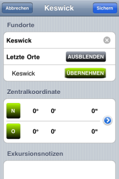 Bevor Sie loslegen können, müssen Sie zunächst etwas Verwaltungsarbeit erledigen und eine Exkursion anlegen. Eine Exkursion enthält die Liste aller Arten, die ein Bearbeiter an einem bestimmten Tag und Ort kartiert. Für unsere Beispielexkursion wählen wir den Ort Keswick im englischen Lake District, den Bearbeiter nennen wir Klaus Mustermann. Sie haben unter den Menüpunkten Kontakte und Letze Bearbeiter Zugriff auf Ihren Kontakte-Ordner bzw. auf die 10 letzten von Ihnen eingetragenen Bearbeiter. Tippen Sie auf Letzte Orte, wenn Sie den Namen eines der letzten 10 von Ihnen erfassten Orte eingeben möchten.